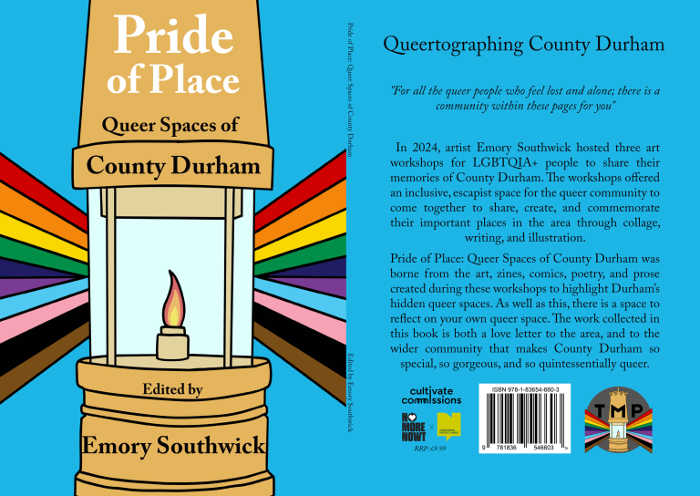 Pride of Place: Queer Spaces of County Durham was borne from the art, zines, comics, poetry, and prose created during these workshops to highlight Durham’s hidden queer spaces. As well as this, there is a space to reflect on your own queer space. The work collected in this book is both a love letter to the area, and to the wider community that makes County Durham so special, so gorgeous, and so quintessentially queer.